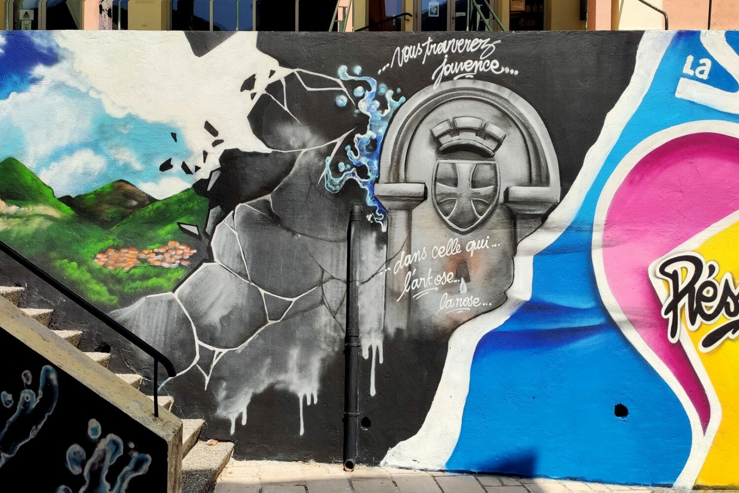 C’est dans le cadre de la Semaine de la Jeunesse, début août 2021 que c’est déroulé un projet street art participatif au coeur du village de Puget-Théniers. Contactés par l’équipe municipale pour organiser une animation avec les jeunes, l’association Phenix Lab a proposé d’une part des ateliers d’initiation au graffiti et d’autre part la réalisation d’une murale dont le thème a été choisi par les habitants du village.
